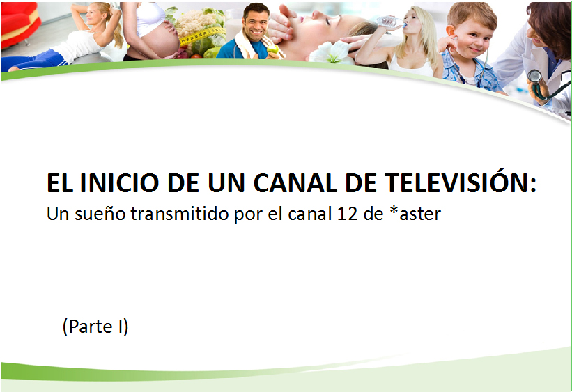 En una reunión semanal del staff de Mercadeo, Publicidad y Relaciones Públicas, el Director de *aster nos reveló la temática del nuevo canal: salud. Todavía no tengo claro si él se percató de mi entusiasmo al escucharlo o si le impactó más la mudez de mis compañeros. Desde esa mañana, hilvané en mi cabeza nombres de programas y posibles temas a desarrollar. Al día siguiente, reposaba en el escritorio del Director una carpeta verde con algunas diez páginas escritas por mí.