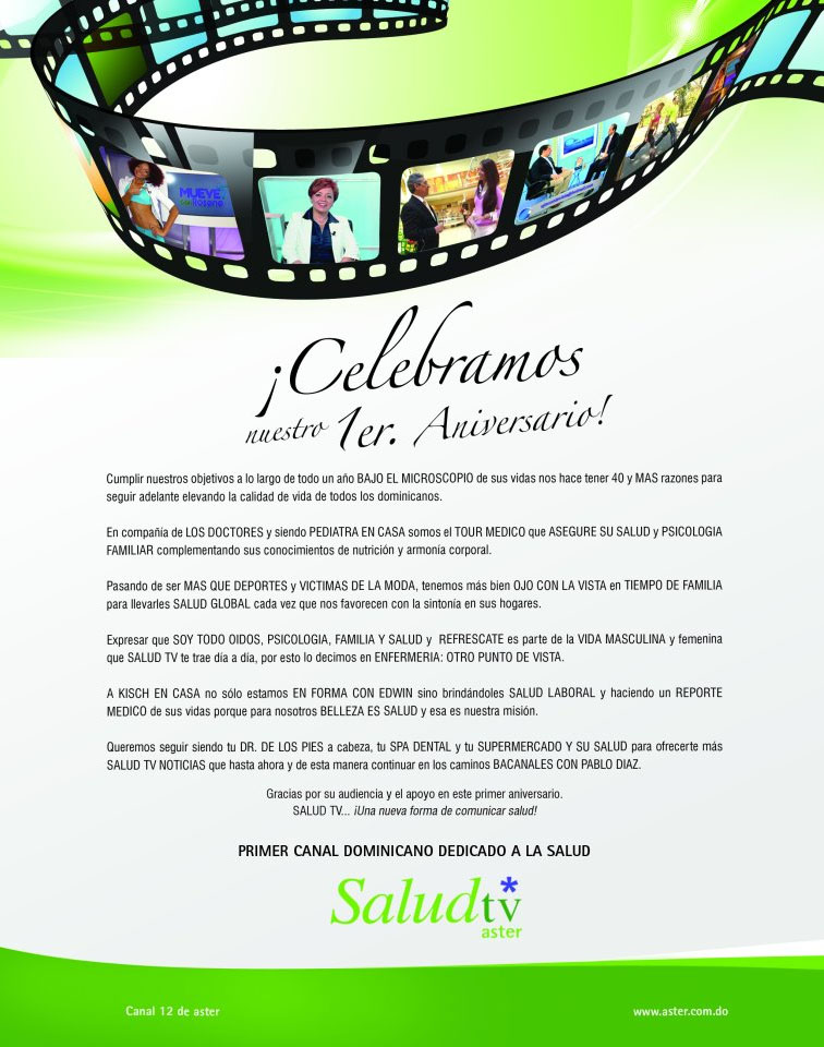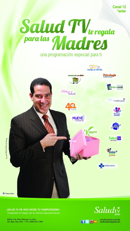 Se abrió un canal por Livestream en www.aster.com.do para ver Salud TV en línea 24/7 en tiempo real. Además, “esta nueva forma de comunicar salud” también estaba presente en varias redes sociales: Youtube, Facebook, Twitter, página Web y correo electrónico. Por último, necesitábamos dar a conocer a la sociedad este nuevo proyecto que se encargaría de guiar a las familias dominicanas hacia un estilo de vida más saludable; para esto se celebró un magno evento social de la mano de la empresa de relaciones públicas Lendof & Asociados dirigida por el ingenioso Wladimir Lendof.
