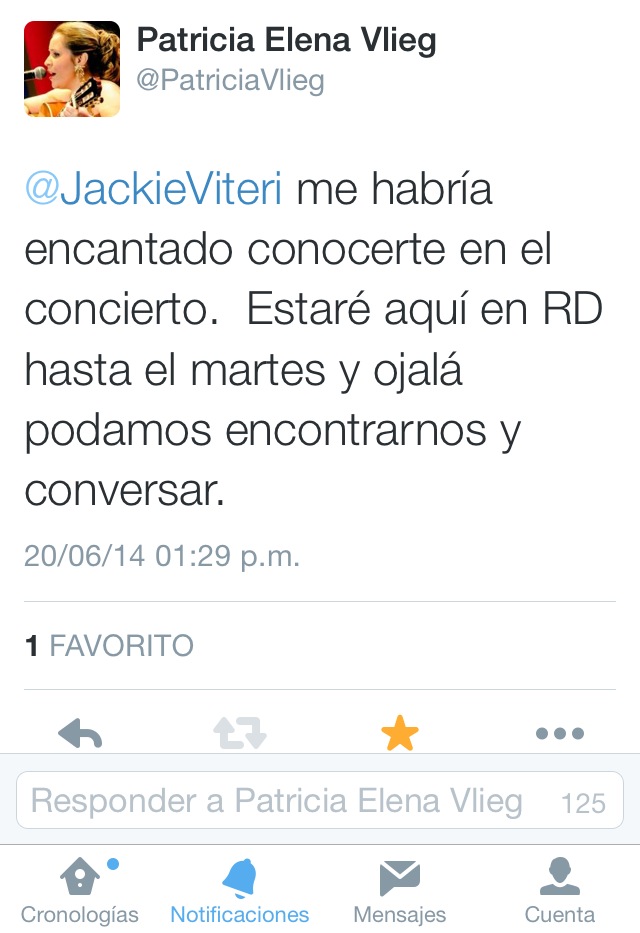 Te felicito por el privilegio de conocerla en persona y por la distinción que tuvo contigo. Espero que esa amistad se consolide y que Patricia Vlieg nos visite nuevamente, para ver si tenemos la oportunidad de disfrutar de su melodiosa voz.